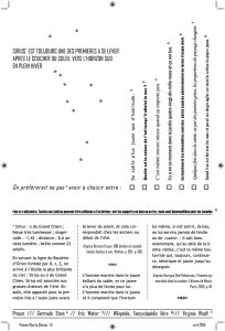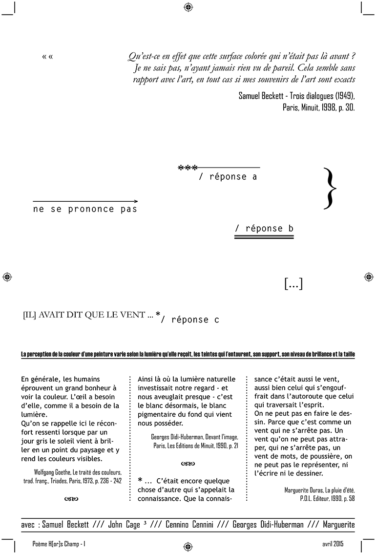 Il convoque des auteurs comme Samuel Beckett, John Cage, Cennino Cennini, Georges Didi-Huberman, Marguerite Duras, Wolfgang Goethe, Gaston Leroux, Herman Melville, Marcel Proust, Gertrude Stein, Virginia Woolf , mais aussi des auteurs peu connus, des plasticiens, des notices de magasin de bricolage, et l’encyclopédie Wikipédia.