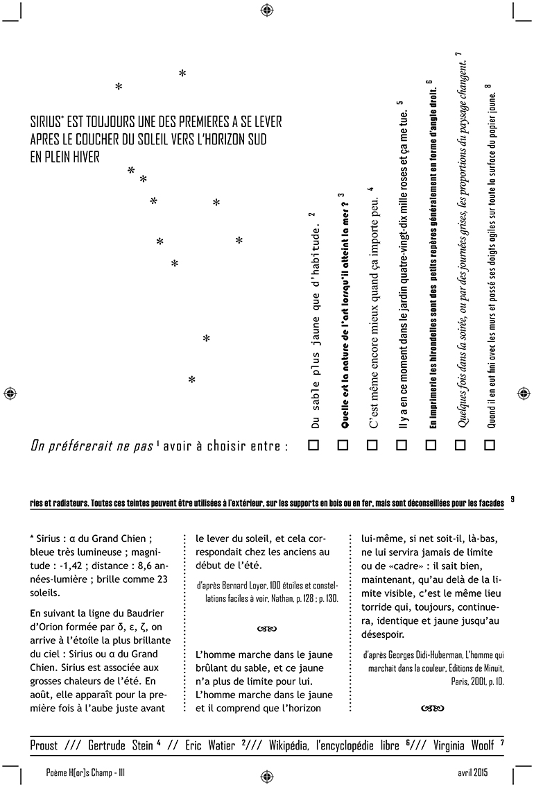 Poème H[or]s Champ est un poème graphique composé à partir de multiples extraits textuels (littéraire, poétique, esthétique, scientifique, usuel). Il est réalisé en lettres adhésives dans la tonalité jaune vif du mur adjacent. Il se déploie en trois grands formats conçus comme trois pages successives et élabore un jeu poétique depuis la couleur jaune.